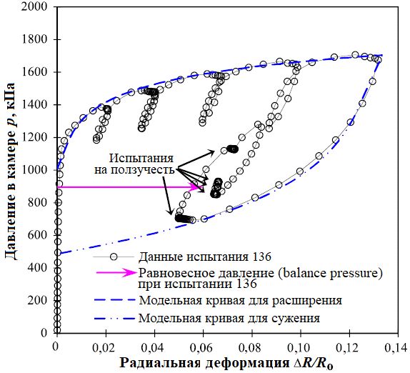 Рис. 6. Кривые, построенные по необработанным данным измерений при прессиометрическом испытании 136 в скважине ТБ-321 и на основе комплексной геомеханической модели грунта с указанием точки равновесного давления (balance pressure point) (по [1])