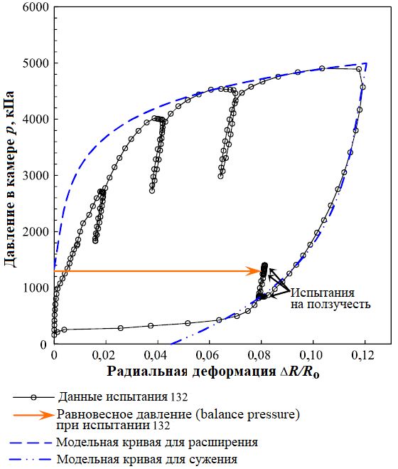 Рис. 7. Кривые, построенные по необработанным данным измерений при прессиометрическом испытании 132 в скважине ТБ-320 и на основе комплексной геомеханической модели грунта с указанием точки равновесного давления (balance pressure point) (по [1])