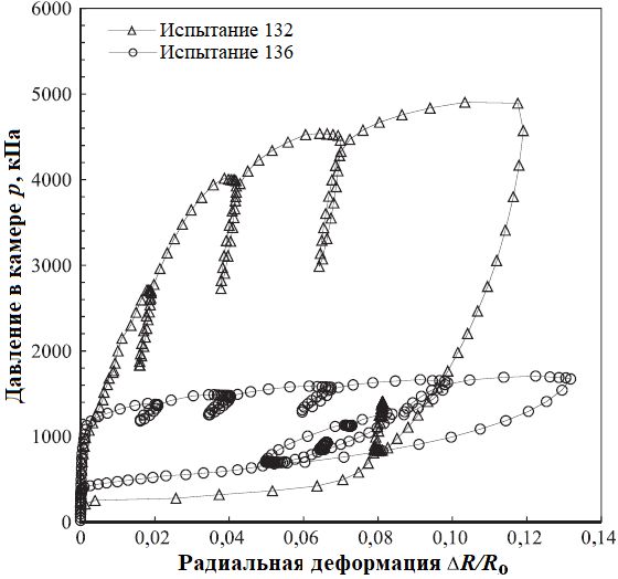 Рис. 8. Необработанные кривые по данным измерений при прессиометрических испытаниях 132 и 136 в скважинах ТБ-320 и ТБ-321 соответственно (по [1])