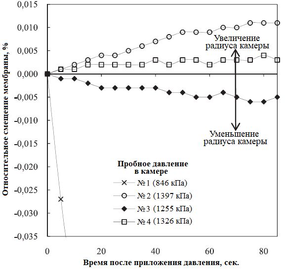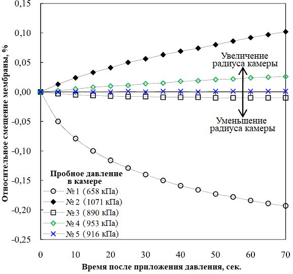 На рисунке 9 показаны результаты пяти тестов при разных давлениях в камере на стадии разгрузки во время испытания SR-99-137. Видно, что давление величиной 916 кПа (№ 5) почти не привело к смещению мембраны, поэтому оно было принято авторами статьи [1] за равновесное для отложений Qpgl на глубине проведения данного испытания.