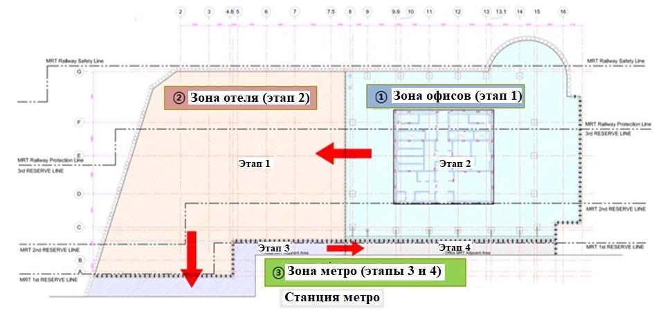 По предложению подрядчика уже на этапе строительства для создания котлована под фундамент была выбрана поэтапная выемка грунта с разделением пятна застройки на подзоны (две над станцией метро и по одной под будущими башней и отелем) (рис. 8). Это позволило лучше контролировать смещения в грунте, конструкциях и прилегающих зданиях и сооружениях, но результаты измерений могли не совпасть с первоначальными прогнозами. Поэтому команда использовала коррекцию моделей и расчетов, ранее полученных в программах gINT и PLAXIS, с помощью данных мониторинга и испытаний грунта, проводимых в процессе земляных работ и строительства. Применялось также совмещение двумерных чертежей и трехмерных моделей в PLAXIS. Все это позволило успешно реализовать проект по строительству котлована и фундамента, а также начать работы по возведению надземных частей одновременно со строительством подземных помещений.