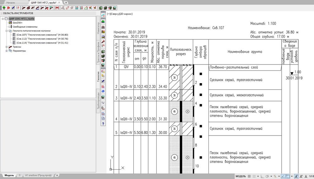 На первом этапе геолог решает набор своих стандартных задач по камеральной подготовке данных инженерно-геологических изысканий. В базе геологических скважин описывает ИГЭ, формирует колонки скважин, вносит в них данные по пробам, статическому зондированию, термокаротажу и т.д. Размещает скважины на топографическом плане как свободные или сразу с привязкой к конкретной трассе. Строит геологический разрез на продольных, поперечных профилях линейных объектов или по сечениям на площадках. В процессе построения разрезов перемещает слои, выполняет выклинивания, создает линзы, проводит линии появления или установления грунтовых вод, проводит расчет глубин сезонного протаивания/промерзания грунтов и многое другое. Результат его работы – графическая часть изыскательского отчета, оформленная согласно нормативным документам и отраслевым стандартам. Плюс набор ведомостей в формате MS Excel.