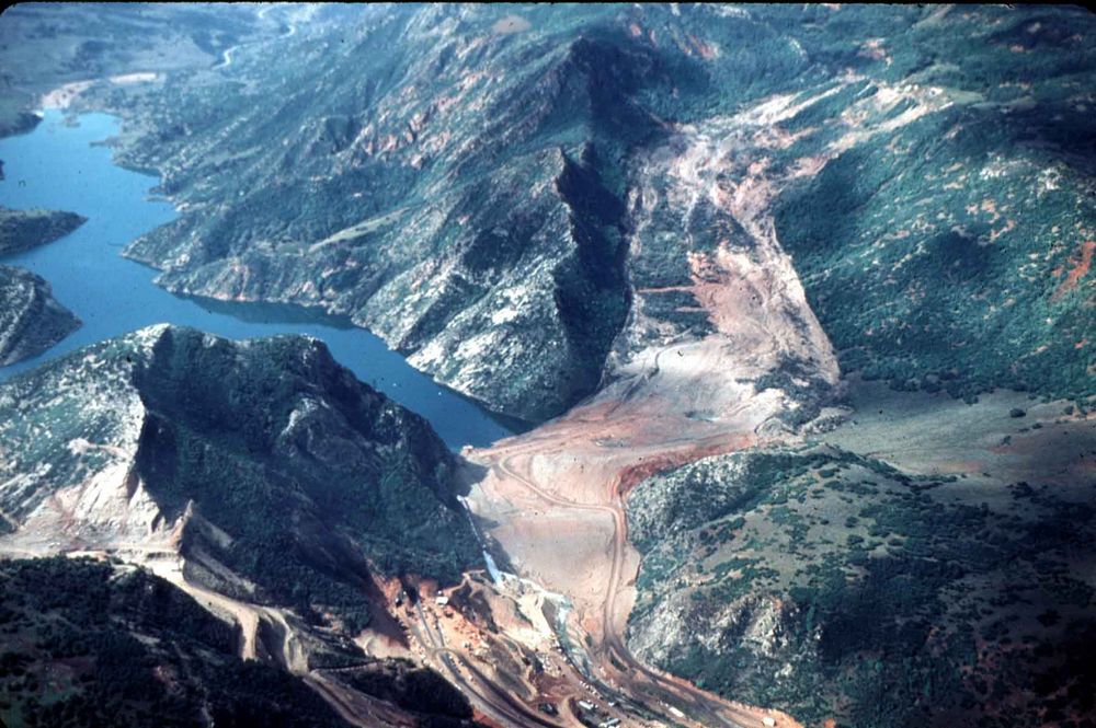 Рис. 2. Оползень, сошедший в 1983 году в центре штата Юта США и перекрывший реку Спаниш-Форк. Образовавшееся запрудное озеро Тристл впоследствии было осушено в качестве меры предосторожности [26]