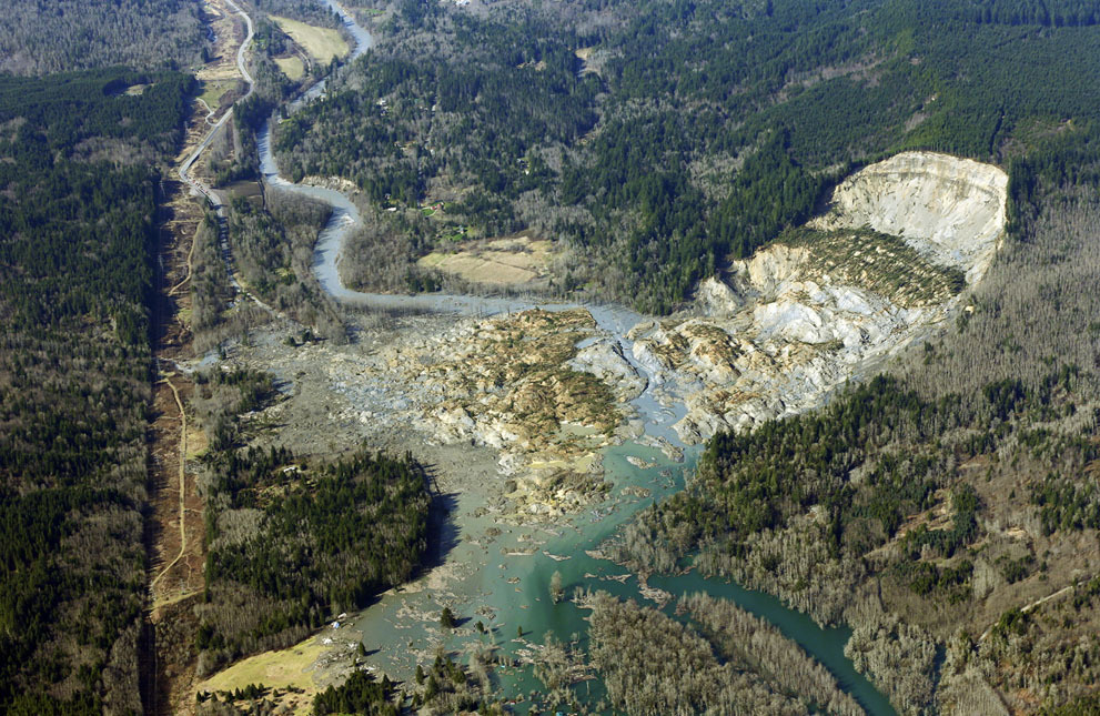 11. Îäèí èç ðàçðóøèòåëüíåéøèõ îïîëçíåé â ÑØÀ ñîøåë 22 ìàðòà 2014 ãîäà â îêðóãå Ñòèëõýä Õýéâí íåäàëåêî îò íàñåëåííîãî ïóíêòà Îñî â øòàòå Âàøèíãòîí (ðèñ. 7). Âûçâàííûé èì ãðÿçåâîé ïîòîê, ñîäåðæàùèé äåðåâüÿ è îáëîìêè ïîðîä, îáðóøèëñÿ íà äîìà, ðàñïîëîæåííûå ïîä ñêëîíîì íà þæíîé ñòîðîíå ðåêè Ñòèëëàãóàìèø. Ñòîëêíîâåíèå ïîòîêà ñ ðåêîé áûëî ïîõîæå íà öóíàìè. Ïðîñòðàíñòâî ðàçìåðîì 460 ì â øèðèíó è 1300 ì â äëèíó ïîêðûëîñü ñëîåì ãðÿçè, êàìíåé, îáëîìêîâ äåðåâüåâ è çäàíèé òîëùèíîé îò 9,1 äî 21,3 ì. Ïåðåêðûòèå îòëîæåíèÿìè ñåâåðíîãî ðóêàâà ðåêè ïðèâåëî ê íàâîäíåíèþ âûøå ïî òå÷åíèþ, à çàòîïëåííûé è ïîêðûòûé ñåëåâûìè îòëîæåíèÿìè êèëîìåòðîâûé ó÷àñòîê àâòîìàãèñòðàëè ¹530, âåäóùåé â ãîðîä Äàððèíãòîí, ïðèøëîñü çàêðûòü íà íåîïðåäåëåííûé ñðîê è îðãàíèçîâàòü îáúåçäíîé ïóòü ïî ãðóíòîâîé äîðîãå â ãîðàõ.