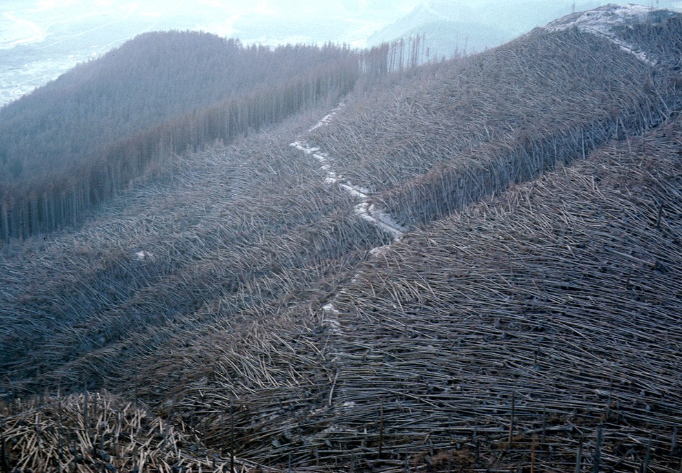 Рис. 14. Тысячи деревьев в районе северного рукава реки Таутл в радиусе 25 км были уничтожены вулканическим взрывом 18 мая 1980 года (снимок сделан 22 августа 1980 года) [8]