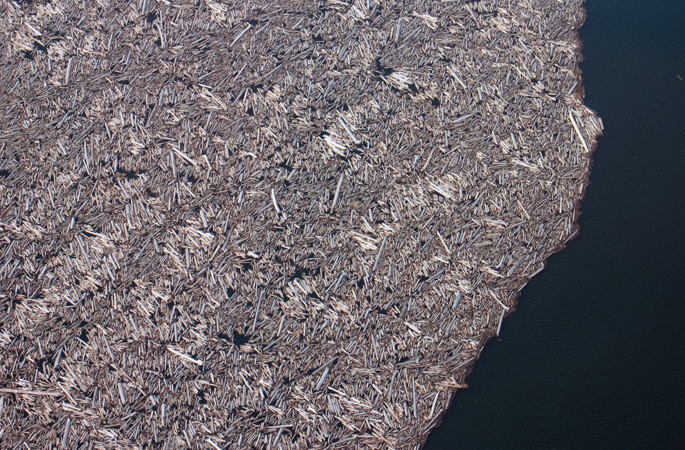 Рис. 15. Часть гигантского оползня-обвала с вершины вулкана Сент-Хеленс обрушилась в озеро Спирит, создав огромную волну, смывшую в водоем со склонов обломки пород и поваленные деревья, которые плавали там не один год [8]