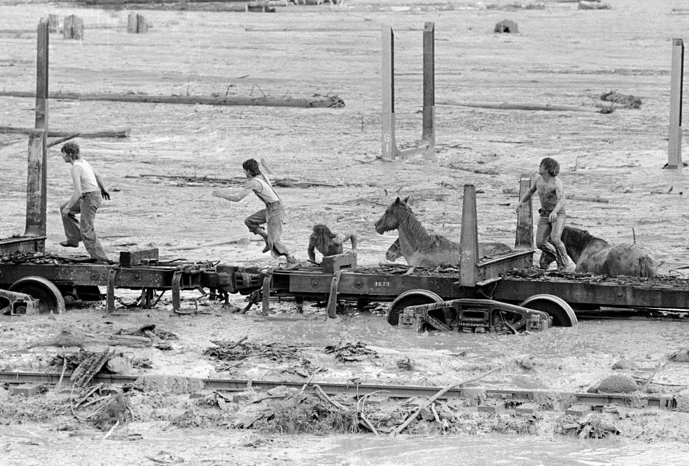 Рис. 18. Люди запрыгивают на железнодорожную платформу во время селя в долине реки Таутл. Мужчинам спастись удалось, но лошади утонули, т.к. уровень в реке поднимался слишком стремительно [8]