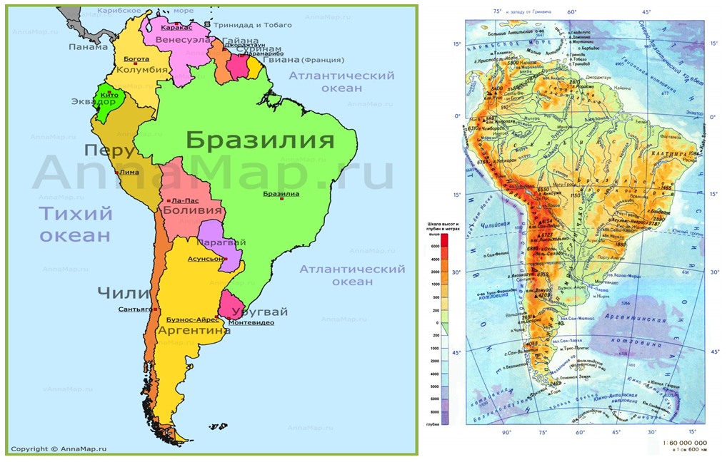 Рис. 1. Политическая и физическая карты Южной Америки [26, 33]