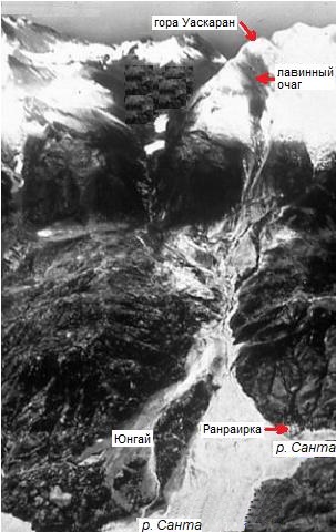 31 мая 1970 года из-за сильного землетрясения (с эпицентром в Тихом океане недалеко от побережья Перу) с вновь дестабилизированного северного склона Уаскарана опять сорвалась значительная часть ледника, которая перешла ниже в мощный высокоскоростной сель объемом около 80 млн куб. м. Он похоронил под собой город Юнгай, остатки Ранраирки, близлежащие деревни и палаточный лагерь чешских альпинистов (рис. 2, 3). Тогда от этого селя погибло более 20 тыс. человек. Как и в 1962 году, сель продолжал движение за Ранраиркой и Юнгаем по долине реки Санта, нанеся огромный ущерб строениям и линейным сооружениям на своем пути. Следует отметить, что вызвавшее это бедствие землетрясение стало причиной многих тысяч или даже десятков тысяч разрушительных склоновых процессов и в других районах Перу (на территориях общей площадью 30 тыс. кв. км с радиусом до 200 км от эпицентра) [4, 5, 17, 25, 32].