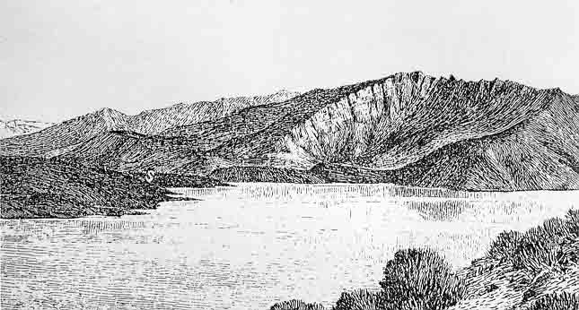 Рис 8. Эскиз озера Лаго-Кари-Лаукен на реке Рио-Барранкас в Аргентине и место схода доисторического оползня, который запрудил реку. На рисунке показано состояние озера после частичного разрушения естественной плотины в 1914 году. Расположение выхода из озера обозначено буквой «S» рядом с левым краем эскиза [30, 32]