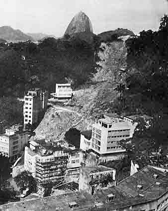 В период с декабря по март сочетание обильных дождевых осадков, крутых склонов, элювиальных отложений и выветрившихся скальных грунтов делает прибрежные горы в южной части Бразилии особенно восприимчивыми к катастрофическим проявлениям склоновых процессов. Рост населения и соответствующего строительства в Рио-де-Жанейро и близлежащих городах распространился из низменностей на склоны, а сопутствующее сооружение автомагистралей потребовало создания огромных выемок по краям склонов и их частичной обратной засыпки. Все это дополнительно усложнило проблемы, связанные с устойчивостью склонов в городских районах. Кратко рассмотрим лишь некоторые наиболее значимые события в этом регионе.