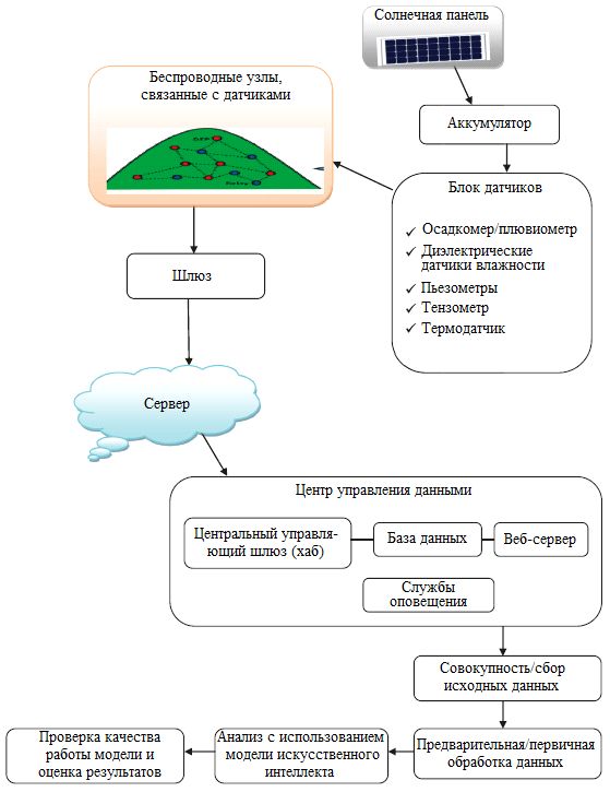 БСС можно рассматривать как систему для прогноза состояния грунтовой среды. Предлагаемая модель мониторинга оползней с использованием ИИ представлена на рисунке 1. На нем показана интеграция множества датчиков, беспроводных узлов, серверов, шлюзов и инструментов прогнозирования с помощью искусственного интеллекта [5]. Эта система интегрирована в структуру склона, предрасположенного к оползням, для постоянного мониторинга параметров, влияющих на оползнеобразование, с помощью инклинометров, диэлектрических датчиков влажности, геофонов, тензометров и пьезометров [6]. Стратегически продуманное размещение беспроводных узлов в грунтовом массиве позволяет создать единую беспроводную ячеистую сеть для передачи информации с датчиков на компьютер через промежуточные беспроводные узлы.