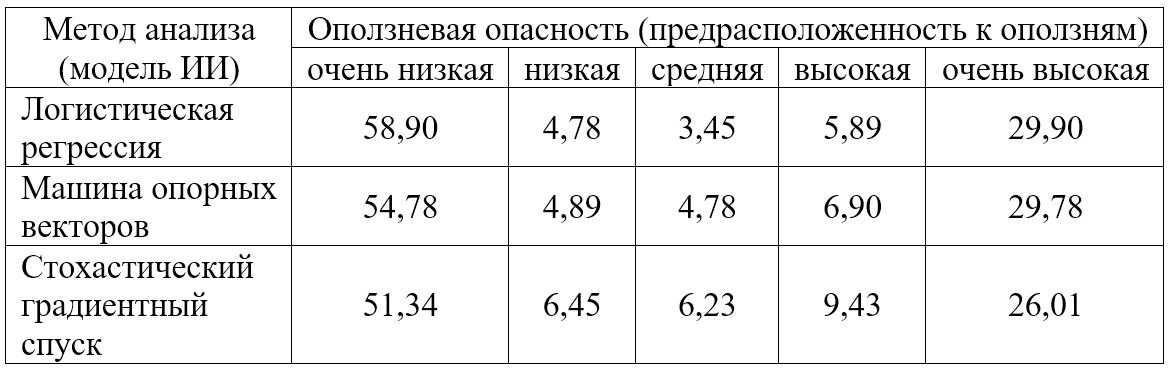 В таблице 3 представлены результаты оценки эффективности трех рассмотренных выше методов. В случае аппроксимации функции оползневой опасности самую высокую эффективность продемонстрировал метод логистической регрессии. Его чувствительность составила 92,76%, а у алгоритма стохастического градиентного спуска она была 84,78%, у машины опорных векторов – 77,67%