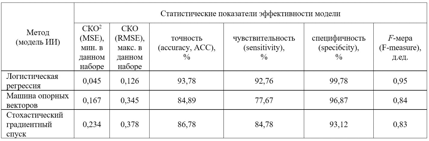 . Метод логистической регрессии показал также наибольшие специфичность (99,78%), точность (93,78%) и F-меру (0,95) и при этом наименьшие СКО=RMSE (0,126) и СКО2=MSE (0,045) (см. таблицу 3).