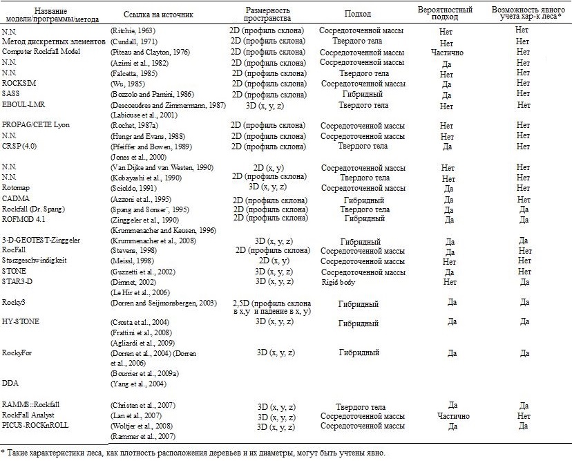 Таблица 1. Основные характеристики ряда существующих моделей траекторий камнепадов (по Guzzetti et al., 2002)