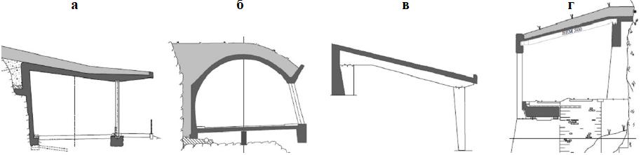 Рис. 11. Различные типы конструкций противокамнепадных галерей (жесткие основные конструкции показаны черным и белым цветом, амортизирующий материал – серым): а – железобетонная плита; б – железобетонная арка; в – монолитная железобетонная конструкция; г – композитная конструкция из стали и железобетона (Vogel et al., 2009)