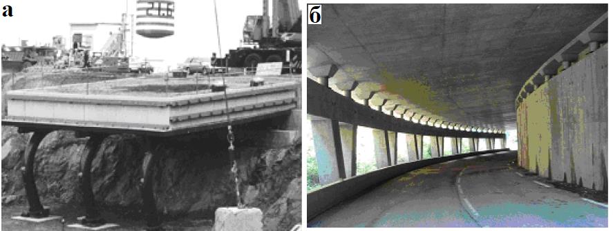Рис. 12. Полномасштабный эксперимент с падением железобетонного снаряда на композитный сталежелезобетонный противокамнепадный навес (Maegawa et al., 2003) (а) и противокамнепадная галерея с рассеивающей энергию воздействий системой опор в альпийском курортном регионе Валь д’Арли во Франции (Masuya, 2007) (б)