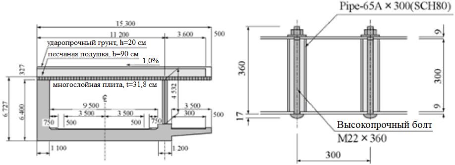 В Японии была оценена эффективность композитных конструкций галерей из стали и железобетона (рис. 12, Maegawa et al., 2003) и композитных многослойных конструкций с высокопрочными болтовыми соединениями (рис. 13, Konno et al., 2008). Они вполне могут применяться в будущем в конкретных условиях.
