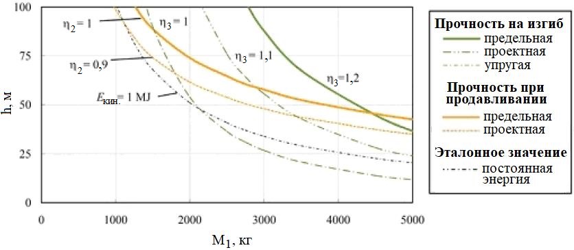 С помощью этой модели были получены значения соотношений между максимальными усилиями и несущей способностью при продавливании (η2) и при разрушении при изгибе (η3), что привело к необходимости использования итерационного процесса для проектирования сооружения. Указанная процедура особенно хорошо подходит для оценки существующих противокамнепадных галерей. На рисунке 16 показаны значения указанных соотношений, достигнутые при падении с разной высоты железобетонных блоков разной массы на галерею Аксен-Сюд в Швейцарии. Будущие оценки зависимостей «сила удара – проникновение камня в подушечный слой» могут улучшить эту модель.