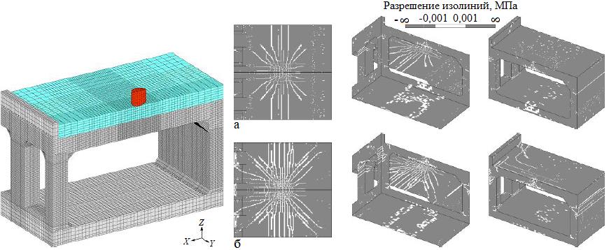 Рис. 17. Общий вид модели для конечноэлементного анализа поведения противокамнепадной галереи при ударе железобетонным блоком и полученные формы трещинообразования для различных случаев нагружения (Kishi et al., 2009)