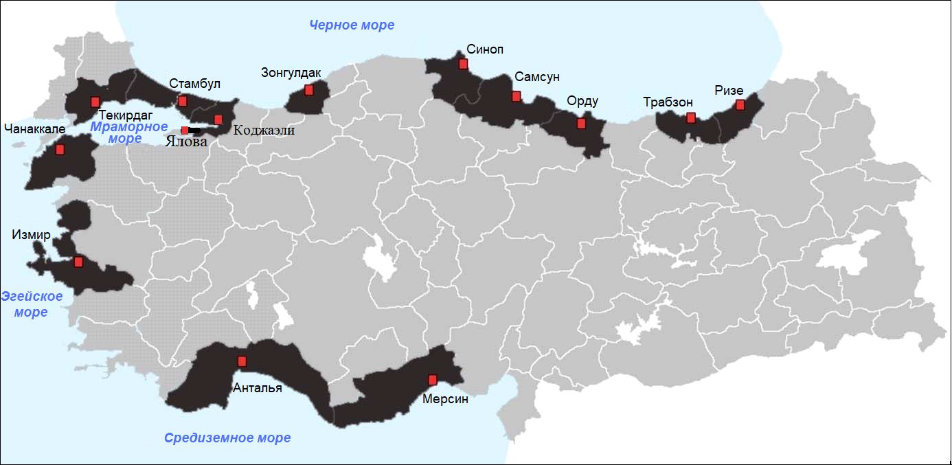 Рис. 1. Крупные прибрежные города Турции (n=14) (по [1])