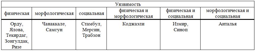 Таблица 2. Прибрежные города Турции, разделенные на типы по уязвимости к повышению уровня моря (по [1])