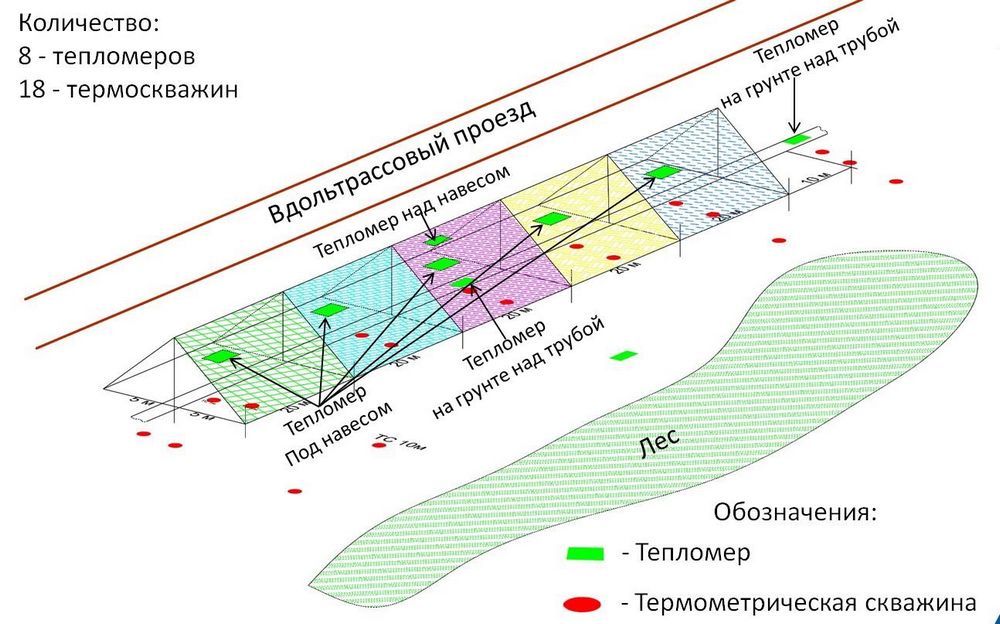 Рис. 8. Размещенные навесы, термометрические скважины и датчики теплового потока подземного нефтепровода