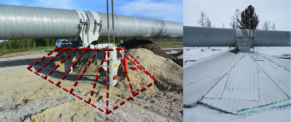 Рис. 6. Опора нефтепровода без навеса, и с навесом и системами мониторинга температуры и тепловых потоков