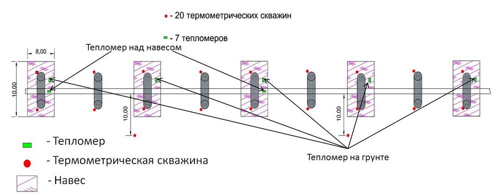 Рис. 5. Схема размещения термометрических скважин и датчиков теплового потока под навесами над опорами надземного нефтепровода