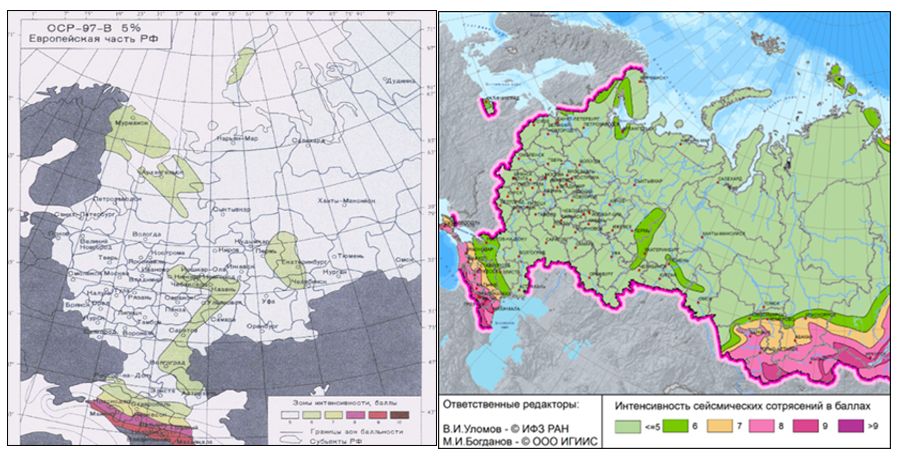 Рис. 1. Нормативные карты общего сейсмического районирования территории РФ: ОСР-97-B (ОИФЗ РАН,1996) [37] (слева); ОСР-2016-B (фрагмент)(справа) [13]