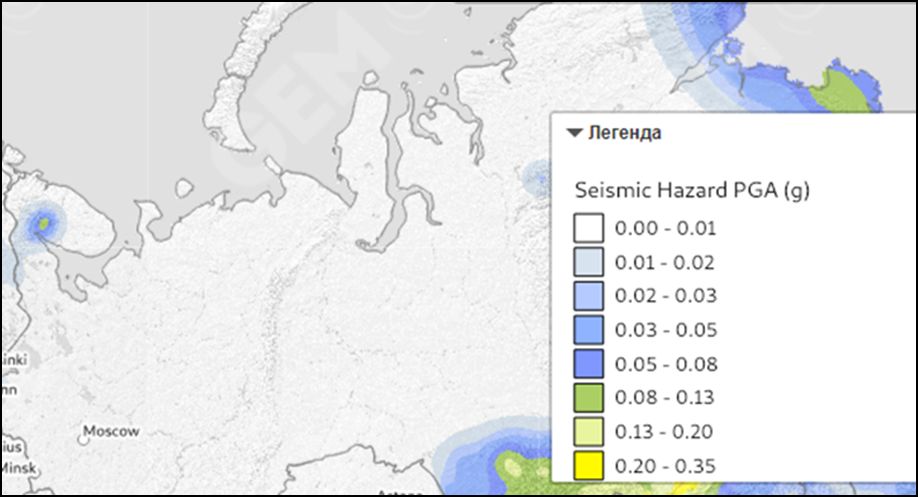 4. В «Североуральской» зоне ВОЗ (Печорское море) при наиболее неблагоприятном сценарном землетрясении (очаг мелкофокусного землетрясения находится непосредственно под площадкой строительства) I0 может составить 7 баллов (детерминированный подход).
