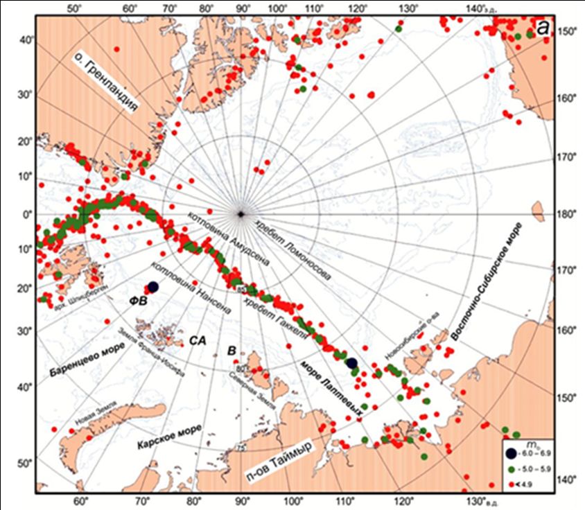 Рис. 3. Эпицентры землетрясений Центрально-Арктического бассейна Северного Ледовитого океана и его обрамления [30]