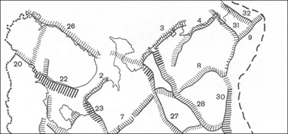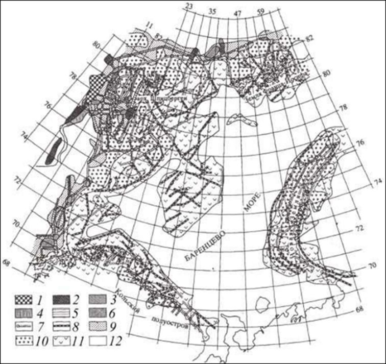 Рис. 4. Схема сейсмоактивных зон (зон ВОЗ) Баренцевоморского региона, м-б 1:2500000 [7]. Зоны, охватывающие узлы и линеаменты с различными значениями mbmax: 1 – 6.0-6.2; 2 – 5.7-5.9; 3 – 5.4-5.6; 4 – 5.1-5.3; 5 – 4.8-5.0; 6 – 4.5-4.7. Линеаменты: 7 – уверенные с mbmax=4.0-4.4; 8 – то же, неуверенные. Поля вне узлов и линеаментов с оценками mbmax: 9 – 4.3-4.4; 10 – 3.9-4.2, уверенно; 11 – то же, неуверенно; 12 — mbmax