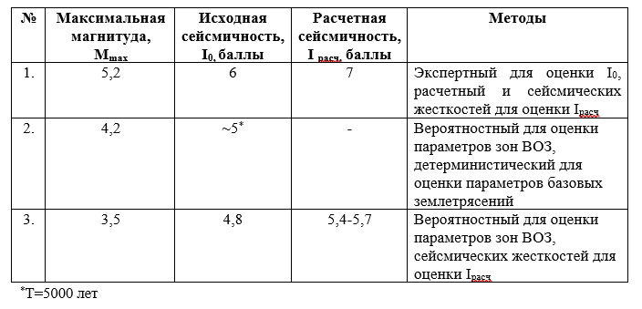 В 2007 г. оценку сейсмической опасности (УИС) рассматриваемой площадки, используя смешанный вероятностно-детерминированный подход [39,40], выполнила компания Geoter S.A.S., в предположении, что расчетные землетрясения в зонах ВОЗ будут иметь место в наиболее уязвимых точках рассматриваемой площадки. Исследования, в частности, показали, что для землетрясений с Т=5000 лет (МРЗ), I0 составляет около 5 баллов (табл.1).