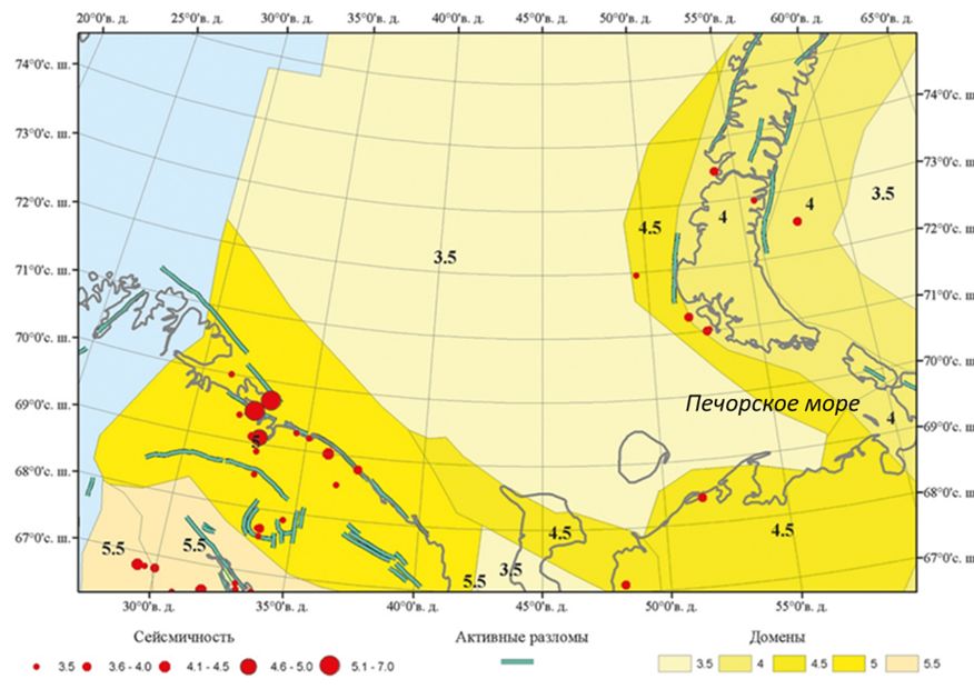 Печорское море. В Печорском море в настоящее время размещено несколько МНГС, а также ряд опасных производственных объектов (ОПО) на прибрежной суше. Все сооружения расположены в пределах Тимано-Печорского региона (плиты), который характеризуется слабой сейсмичностью (рис. 1), в пределах доменов с М= 4,5 (рис. 6).
