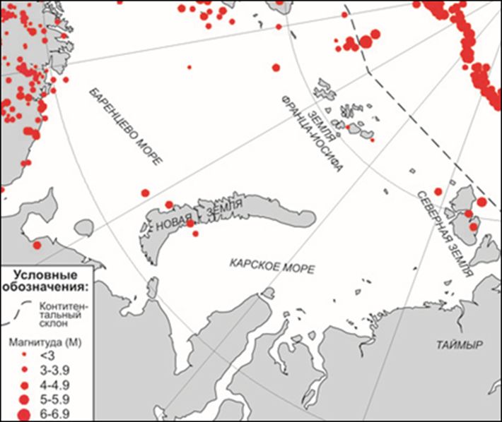 Невзирая на то, что большая часть шельфа Баренцева, Печорского и Карского морей относится к районам с низкой степенью сейсмической опасности (приморская суша указанных морей расположена в пределах зоны с ожидаемой интенсивностью землетрясений по картам ОСР-2016 А, В и С – 5 баллов по шкале MSK-64) (рис. 1, 2), в пределах окраинных частей Баренцева и Карского морей имели место землетрясения с магнитудами (М) менее 4,9, 5,0–5,9, а в наиболее сейсмически активном желобе (грабене) Франц-Виктория даже больше 6,0 (рис.3). В этой связи актуальным является выполнение на шельфе рассматриваемых морей общего сейсмического районирования (ОСР) и детального сейсмического районирования (ДСР), которые до настоящего времени не проводились.