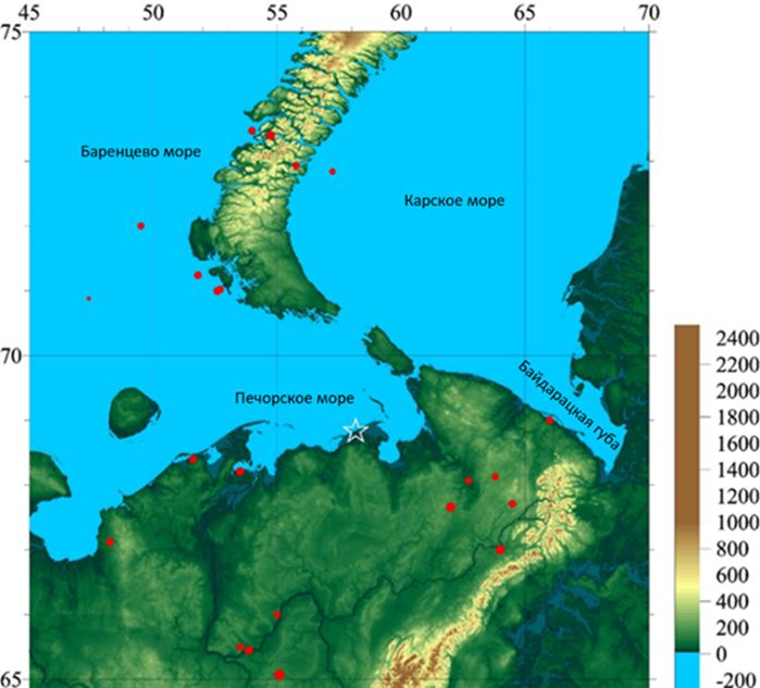 Рис. 8. Карта Печорского моря и юго-западной части Карского моря с эпицентрами землетрясений