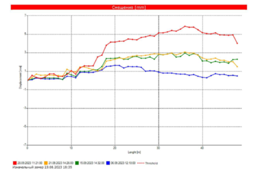 Измерения производят инженер-геотехник и техник с портативным инклинометрическим комплектом. Измерения одного канала (туда-обратно) длиной 70 метров в среднем занимает 15-20 мин с точностью ± 0,05 % измерительного диапазона, что соответствует требованиям ГОСТ 24846 [5]. При практических измерениях осадок насыпи с длиной канала 90 метров, ошибка составляла не более 3-х мм. При этом, первичный анализ полученных данных можно производить сразу после измерений, т.к. на экране считывающего устройстве комплекта сразу отображается график измерений.