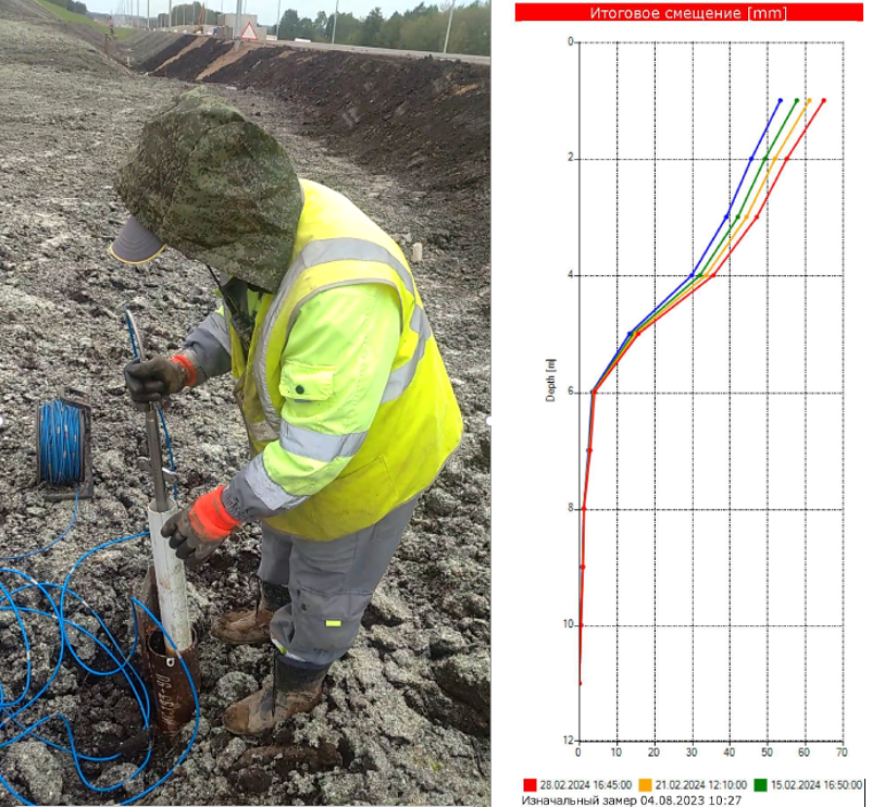 Рис. 6. Измерение сдвига основания насыпи в вертикальной инклинометрическая скважине и результат