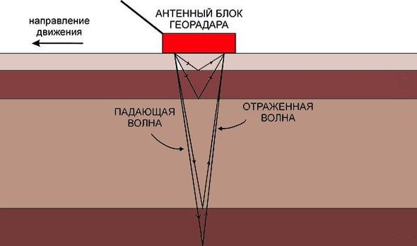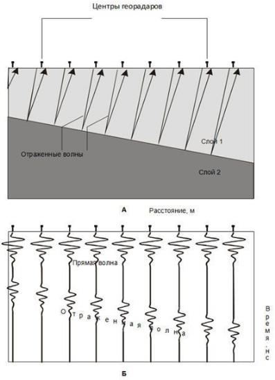 Проходя сквозь изучаемую среду, волны частично отражаются от границ раздела между материалами с разными электрофизическими свойствами (от границ между пластами различных грунтов, слоев с разной влажностью, от уровней подземных вод, пустот, металлических или бетонных предметов, валунов и т.д.) и в ослабленном виде возвращаются к поверхности, где улавливаются приемной антенной, преобразуются в цифровой вид, обрабатываются и запоминаются (рис. 3, 4).
