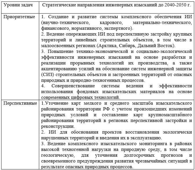 Табл. 1. Приоритетные и перспективные стратегические направления инженерных изысканий (ИИ) на период до 2040-2050 г.