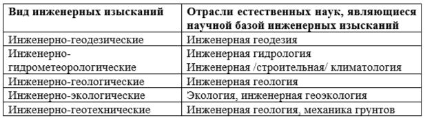 Табл. 2. Виды инженерных изысканий и отрасли естественных наук, являющиеся их научной базой