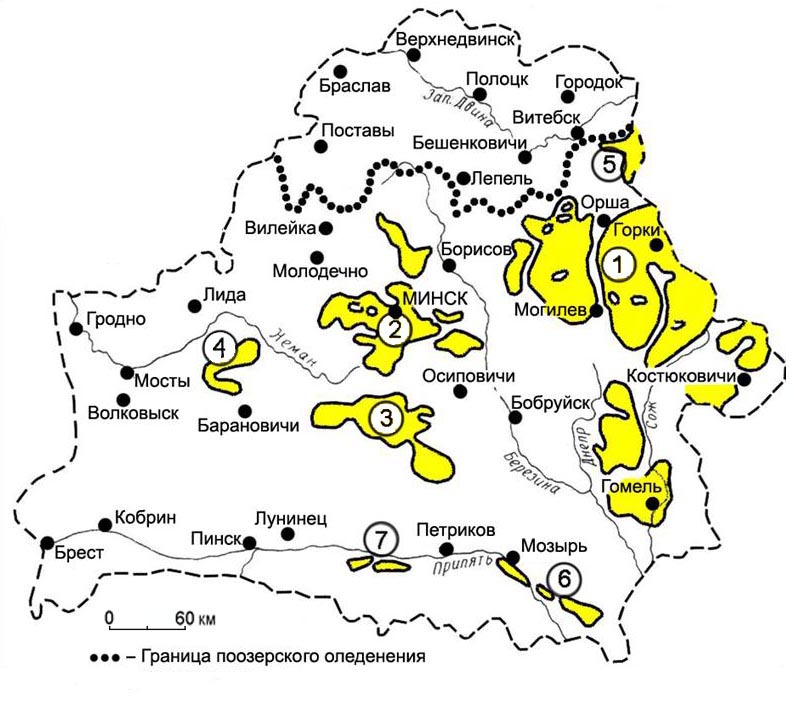 Рис. 1. Основные районы распространения массивов лёссовых и лёссовидных грунтов на территории Белоруссии [16]: 1 – Оршанско-Могилёвский; 2 – Минский; 3 – Слуцкий; 4 – Новогрудско-Кореличский; 5 – Лиозненский; 6 – Мозырско-Хойникско-Брагинский; 7 – Туровский