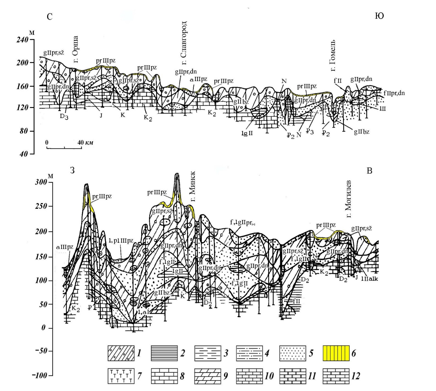 Рис. 2. Схематические геологические разрезы по линиям: (a) Орша – Славгород – Гомель, (b) Минск – Могилев, ([22] с изменениями). 1 – моренные супеси и суглинки; 2 – глина; 3 – суглинок; 4 – супесь; 5 – песок; 6 – лессы и лессовидные грунты; 7 – торф; 8 – мел; 9 – мергель; 10 – известняк; 11 – доломит; 12 – доломитизированный известняк