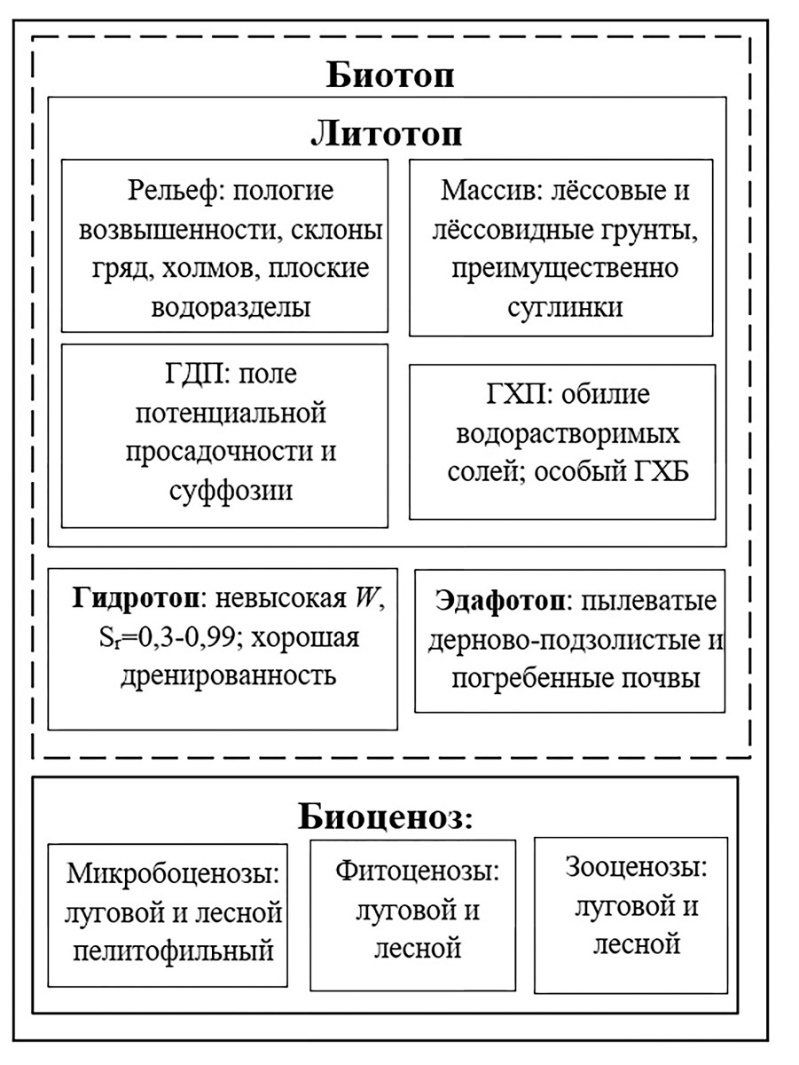 К абиотическим компонентам рассматриваемых ЭГС относятся литотоп, гидротоп и эдафотоп (почвы) [12]. Последние согласно В.И. Вернадскому являются биокосным компонентом. В состав литотопа входят: грунтовый массив определенного состава и строения, рельеф его поверхности, а также сформированные в пределах массива геодинамические и геохимические поля (рис. 3). К основным особенностям литотопа ЭГС массивов лёссовых грунтов Белоруссии можно отнести следующее.