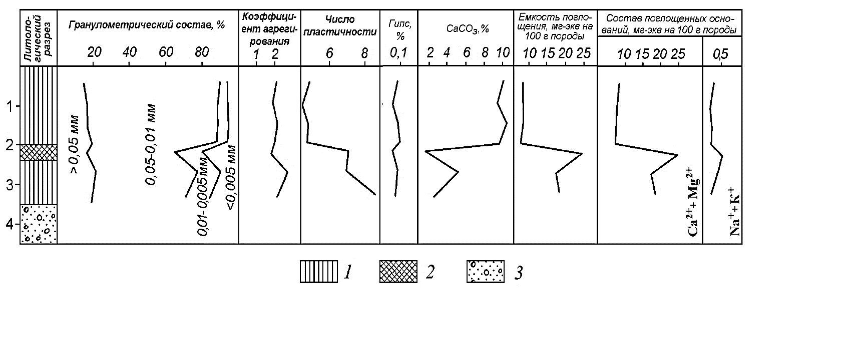 Рис. 4. Состав и свойства лёссовидных грунтов по разрезу Поднепровье в районе г. Орша Витебской области [21]: 1 – лёссовидные супеси и суглинки; 2 – погребённая почва; 3 – сожская морена