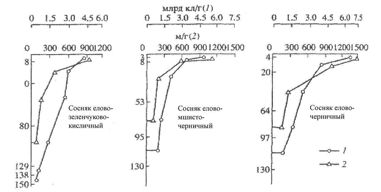 Численность бактерий в лесных подстилках хвойных насаждений варьирует в пределах 4–7 млрд бактериальных клеток на 1 г подстилочной массы (4224,0–6681,0 млрд кл/г), биомасса которых равна 0,085–0,134 мг/г лесной подстилки. В гумусовых, подзолистых, гумусово-подзолистых и иллювиальных горизонтах численность бактерий заметно снижается и составляет 1–4 млрд кл/г почвы, биомасса которых равна 0,012–0,086 мг/г почвы. Суммарная биомасса почвенных грибов и бактерий в лесных подстилках 3,64–5,93 мг/г почвы, при этом в минеральных почвенных горизонтах она составляет 0,026–2,310 мг/г почвы.