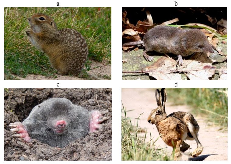 Рис. 10. Луговые млекопитающие ЭГС массивов лёссовых и лёссовидных грунтов: a – суслик крапчатый (Spermophilus suslicus); b – бурозубка обыкновенная (Sоrех araneus); c – крот европейский (Talpa europaea); d – заяц-русак (Lepus europaeus) [26]