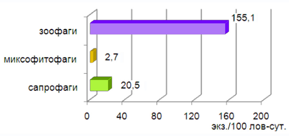 Так, исследования почвенной мезофауны, проведенные Н.В. Гуриной в еловых лесах центральной части Белоруссии [9], развитых на лёссовых и лёссовидных грунтах, позволили выявить 214 видов беспозвоночных, относящихся к 34 семействам и 133 родам. Наибольшим количеством видов представлены пауки – 122, из которых 5 видов отмечены для региона впервые – Formiphantes lepthyphantiformis, Glyphesis cottonae, Megalepthyphantes pseudocollinus, Palliduphantes pillichi, Tegenaria atrica. В комплексе беспозвоночных здесь также выявлено 46 видов жужелиц и 21 вид двупарноногих многоножек. Остальные 4 группы беспозвоночных представлены значительно меньшим числом видов: сенокосцы – 10, губоногие многоножки – 6, дождевые черви – 7, мокрицы – 2 видами. В комплексах беспозвоночных выявлены представители трех трофических групп: зоофаги, сапрофаги и миксофитофаги. Зоофаги представлены 175 видами и доминируют по динамической плотности (рис. 11). Сапрофагов установлено 30 видов с более низкой динамической плотностью. Среди миксофитофагов отмечено 9 видов.