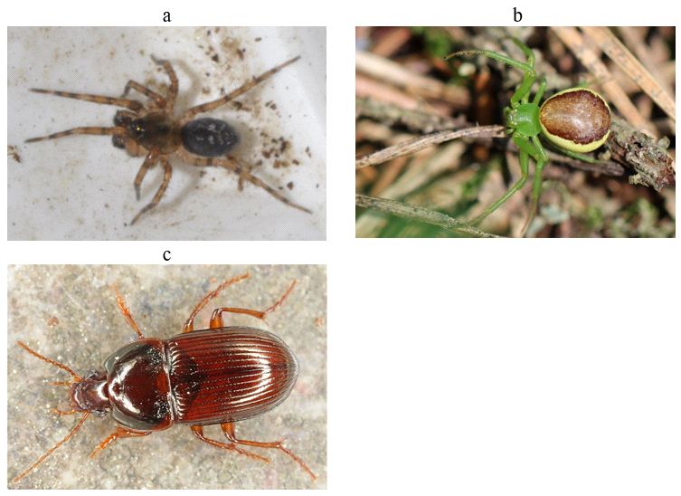 Рис. 13. Доминанты почвенной мезофауны ельника кисличного: a – Cryphoeca silvicola; b – Diaea dorsata; c – Amara brunnea [29]